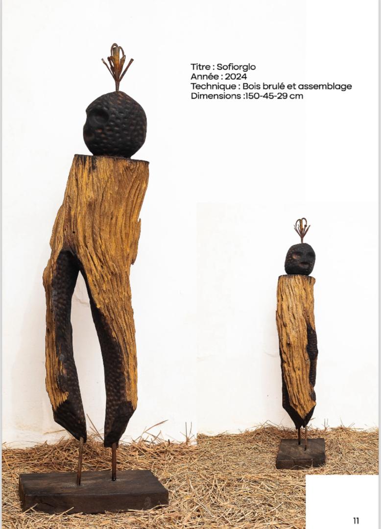 Dans cet univers purement évocateur du spirituel, ‘’Sofiorglo’’ se distingue. Sculptée en 2024 selon la technique du bois brulé et de l’assemblage, elle se dresse de manière atypique. Avec allure, au visage scarifié, ni homme ni femme, mais absolument humain. Dans sa tête est planté un objet métallique comportant de petites branches tantôt courbées. « Ce sont des antennes pour capter les ondes spirituelles », poursuit le curateur. De son buste au pieds gauche et droit suspendus sur deux barres de fer, plantés dans une planche de bois, on remarque un trou. Haute d’1m50, 45-29 cm. ‘’Sofiorglo’’, vient de Sofior, le totem et de Glo, la terminaison du nom de famille de l’artiste Agbetoglo. Pour lui, ‘’Sofiorglo’’ occupe une place de choix. Elle est spéciale.