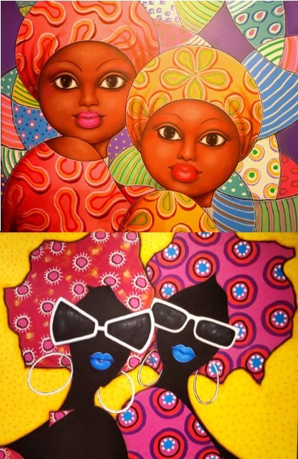 Les couleurs traduisent les humeurs des femmes fortes d’Augustin Kassi. Elles sont généralement représentées en portrait. Mais l’artiste crée aussi des effets visuels sur de petites toiles avec deux ou trois de ses muses. Sur les tableaux en noir et blanc, les humeurs changent. Elles sont soit en prière, soit en méditation, expression d’une connexion divine où la lumière jaillit de l’arrière-plan pour les mettre en avant. Si elles ne prient pas, elles dégagent une certaine assurance. Elles portent les cheveux afro ou des locks, ont les bouches déformées, semblent dire quelque chose. Sans oublier, les lunettes de soleil tendance, devenues une marque déposée chez Kassi.