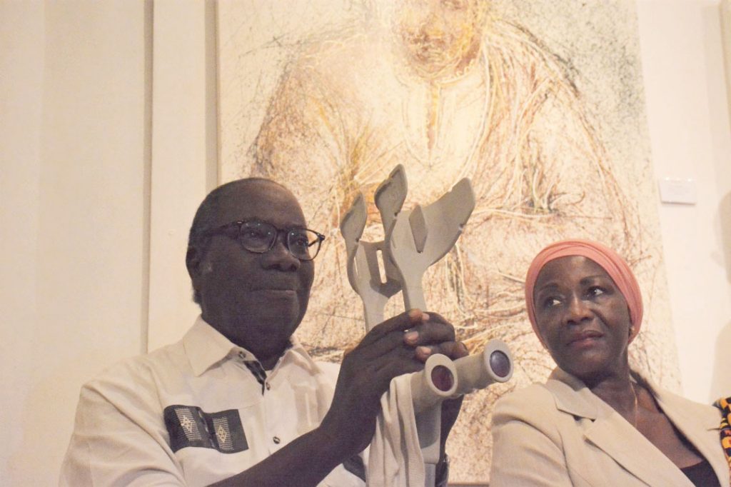 Ce mercredi sur les cimaises de la Rotonde des arts où ses œuvres trônent, la femme est encore au cœur de ses créations. Pour sûr, il la magnifie. Cet être est souvent accompagné d’enfant. Ces deux créatures mises ensemble, constituent le nœud de sa création. Au-delà, le maître touche des questions existentielles. « Je pense donc j’ai des soucis ». Le titre de l’œuvre arrache le sourire mais force le repli sur soi, la pensée par soi, l’acceptation de sa condition. Dans un décor noir (le sol) et bleu (l’horizon) un homme robuste, musclé, est en pleine réflexion, une main sur la tête et l’autre sur le genou. Comme quoi, ni la force, ni l’intelligence ne dissipent les soucis.