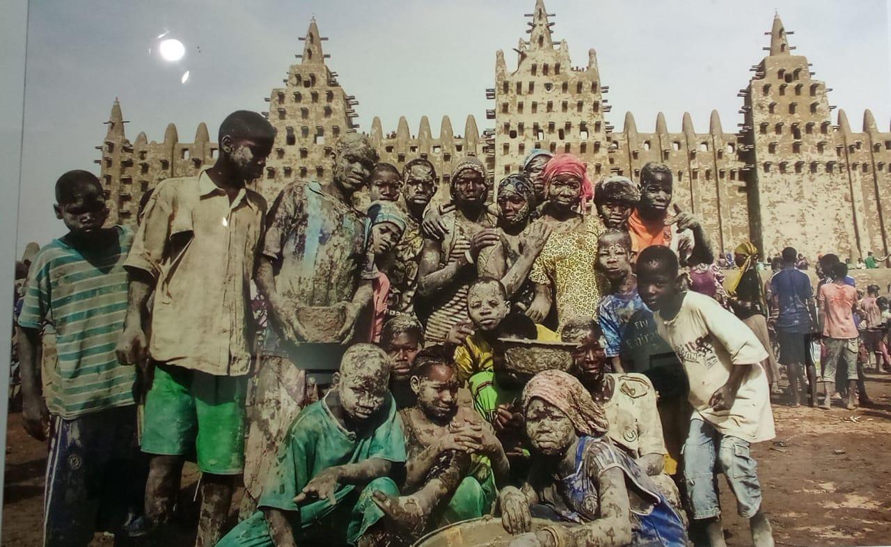 Nous avons mis le deuxième cliché en dernier exprès puisque c’est celui qui nous a le plus interpellée en tant que Tunisienne ne connaissant rien à cette pratique. En effet, ce cliché montre un groupe d’habitants de Djenné venus participer au crépissage annuel de la Grande Mosquée de la ville. Toute la population se doit de venir crépir cet édifice religieux musulman. Le crépissage se fait avec du banco, ou terre crue utilisée avec un peu de transformations pour en faire un matériau de construction. La Mosquée de Djenné est le plus grand édifice du monde entièrement construit en banco.