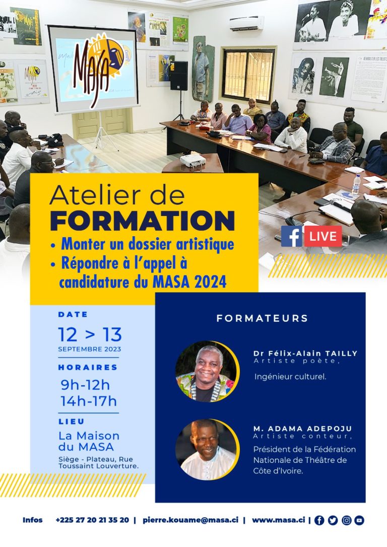 Dr Alain Tailly (ingénieur culturel) et Adama Adépuju dit Taxi Conteur (président de la Fédération nationale du théâtre de Côte d’Ivoire) sont les éminences grises qui ont en charge cette tâche ardue de formation. Une bonne aubaine pour les créateurs ivoiriens de se familiariser avec le montage de dossiers artistiques aussi bien pour le Masa que pour tout autre festival à travers le monde.