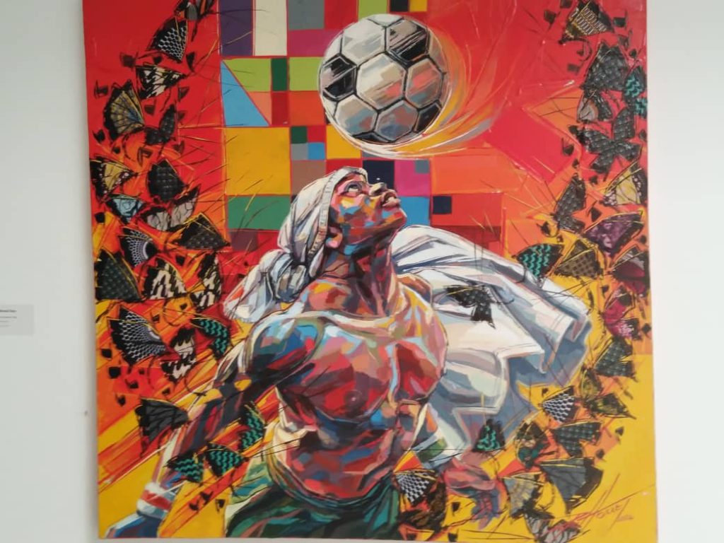 Poitrine nue bombée, narine dilatée, menton levé, le regard en l’air fixant une balle, le personnage de la toile « C’est pour ma patrie », exprime l’engagement lors des parties de foot, surtout lors des compétitions comme la CAN. « Il faut se battre, jouer avec le cœur. C’est l’expression d’un sentiment de fierté quand on va chercher la victoire là où elle se trouve pour la ramener chez nous », incite l’artiste.