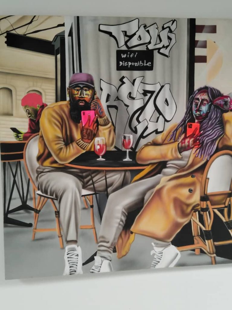 « Comme tu le constates, on est à Abobo. Ici (montrant une toile), c’est ‘’Enjaillement de pied’’. On est dans l’argot abobolais. Je vois ces parties de maracana. On veut rappeler que par un moment de plaisir avec la balle, on peut être heureux. On est toujours dans le principe de la diversité dans l’unité. Abobo étant une commune populaire, chaque papillon sur la toile représente une identité. Les papillons enveloppent la scène principale de la toile à l’infini. Pour rappeler que le foot est universel et intemporel. On a joué au foot hier, on joue au foot aujourd’hui et on jouera au foot demain », explique Soro Péhouet l’une de ses deux toiles exposées.