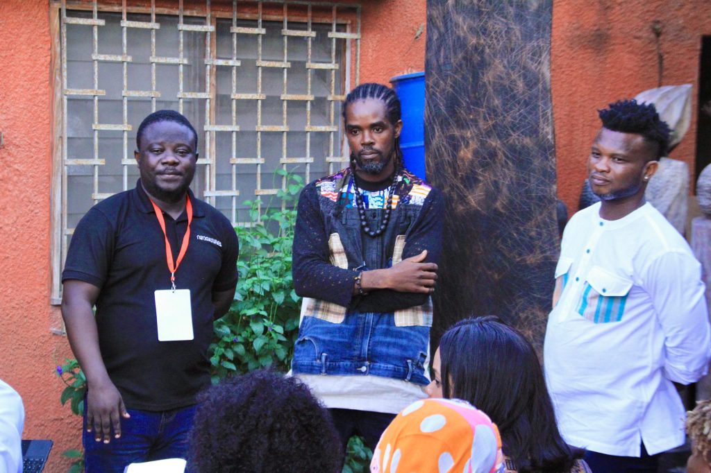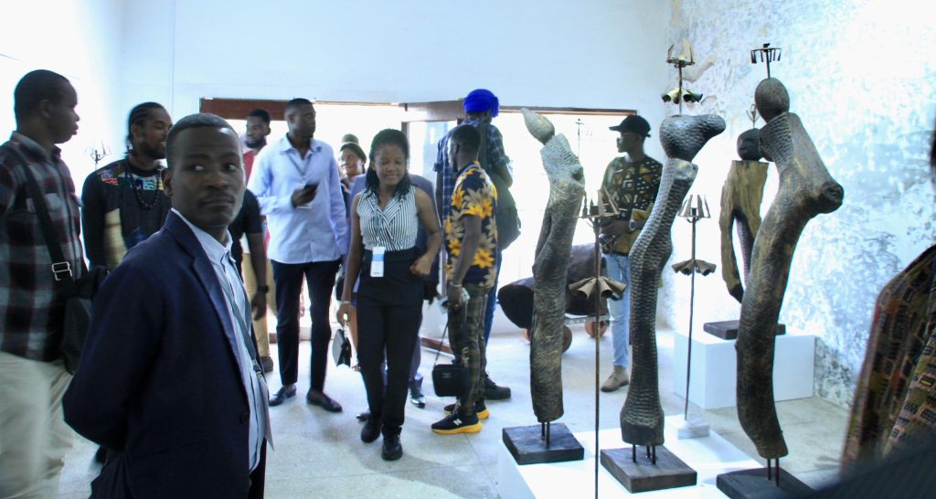 Pendant que Steven nous parle de son art et qu’il décortique le pan spirituel de son œuvre, un fait marquant se produit. Deux prêtres traditionnels arrivent. Ce sont deux hommes d’un certain âge, de blanc vêtu, le pagne noué au buste et de la hanche jusqu’au pied, sans chaussures, ni montres, ni bijoux. Sans dire mot à personne, ils s’installent sur des troncs de bois posés à l’entrée de l’atelier. Ils contemplent les lieux. Ils admirent ce qui s’y déroule. A l’approche de l’artiste chef des lieux, ils affirment avoir écouté l’appel du sacré, leur sommant de venir nous voir. « Leur présence augure de bonnes ondes et nous protège », rassure le curateur.