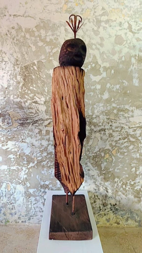 Dans cet univers purement évocateur du spirituel, ‘’Sofiorglo’’ se distingue. Sculptée en 2024 selon la technique du bois brulé et de l’assemblage, elle se dresse de manière atypique. Avec allure, au visage scarifié, ni homme ni femme, mais absolument humain. Dans sa tête est planté un objet métallique comportant de petites branches tantôt courbées. « Ce sont des antennes pour capter les ondes spirituelles », poursuit le curateur. De son buste au pieds gauche et droit suspendus sur deux barres de fer, plantés dans une planche de bois, on remarque un trou. Haute d’1m50, 45-29 cm. ‘’Sofiorglo’’, vient de Sofior, le totem et de Glo, la terminaison du nom de famille de l’artiste Agbetoglo. Pour lui, ‘’Sofiorglo’’ occupe une place de choix. Elle est spéciale.