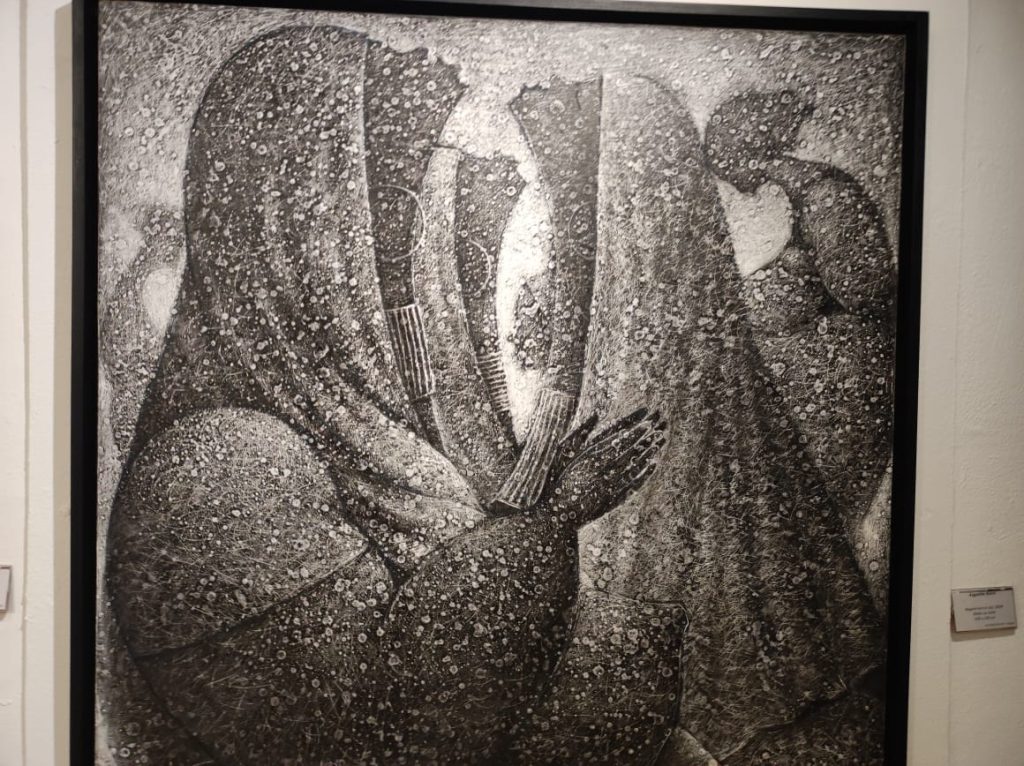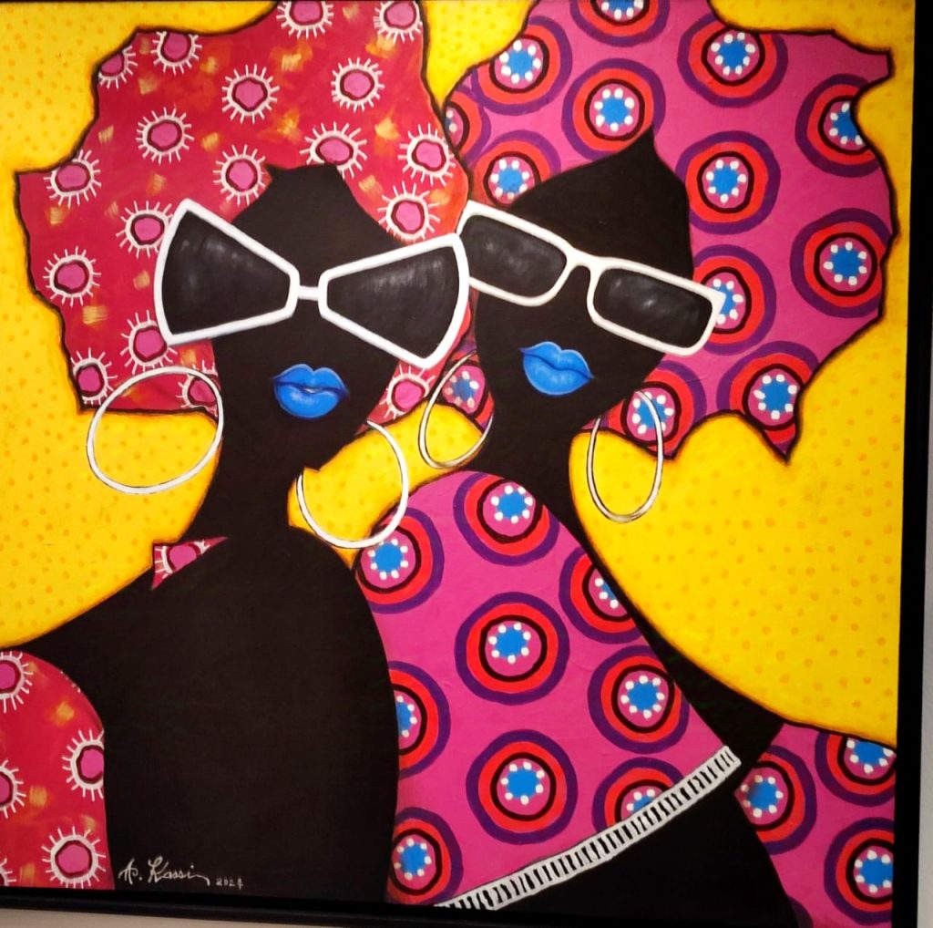 Les couleurs traduisent les humeurs des femmes fortes d’Augustin Kassi. Elles sont généralement représentées en portrait. Mais l’artiste crée aussi des effets visuels sur de petites toiles avec deux ou trois de ses muses. Sur les tableaux en noir et blanc, les humeurs changent. Elles sont soit en prière, soit en méditation, expression d’une connexion divine où la lumière jaillit de l’arrière-plan pour les mettre en avant. Si elles ne prient pas, elles dégagent une certaine assurance. Elles portent les cheveux afro ou des locks, ont les bouches déformées, semblent dire quelque chose. Sans oublier, les lunettes de soleil tendance, devenues une marque déposée chez Kassi.