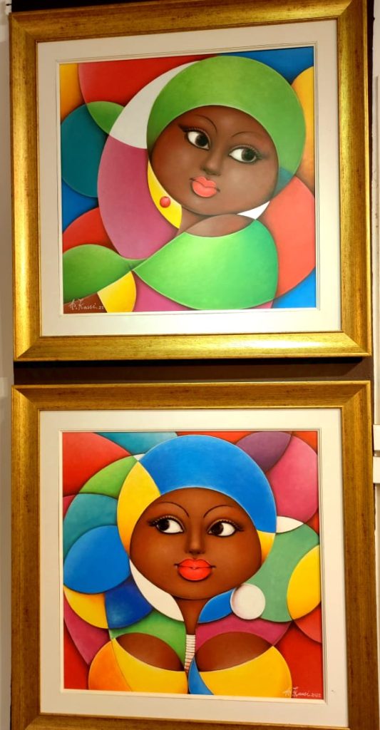 Le peintre n’a jamais caché son admiration pour les femmes en chair. « Peut-être que je recherche ce que je n’ai pas (au plan morphologique) auprès de ces femmes », nous avait-il confié. Sans compromission, sa fidélité est toujours intacte. Seulement, l’artiste a recomposé l’univers de ces dames qu’il présentait dans sa dernière exposition individuelle, en 2022, en tricot body porté sur du pantalon collant. Elles sont plus en confiance, cassent les codes. Certaines ont le teint expressément foncé (noir). Elles arborent du rouge à lèvre bleu, des lunettes de soleil stylées. Les coiffes en pagne sont en harmonie avec leurs vêtements. Mais elles sont saccadées, accentuant les visages allongés contre les visages ronds qu’il a l’habitude de peindre.