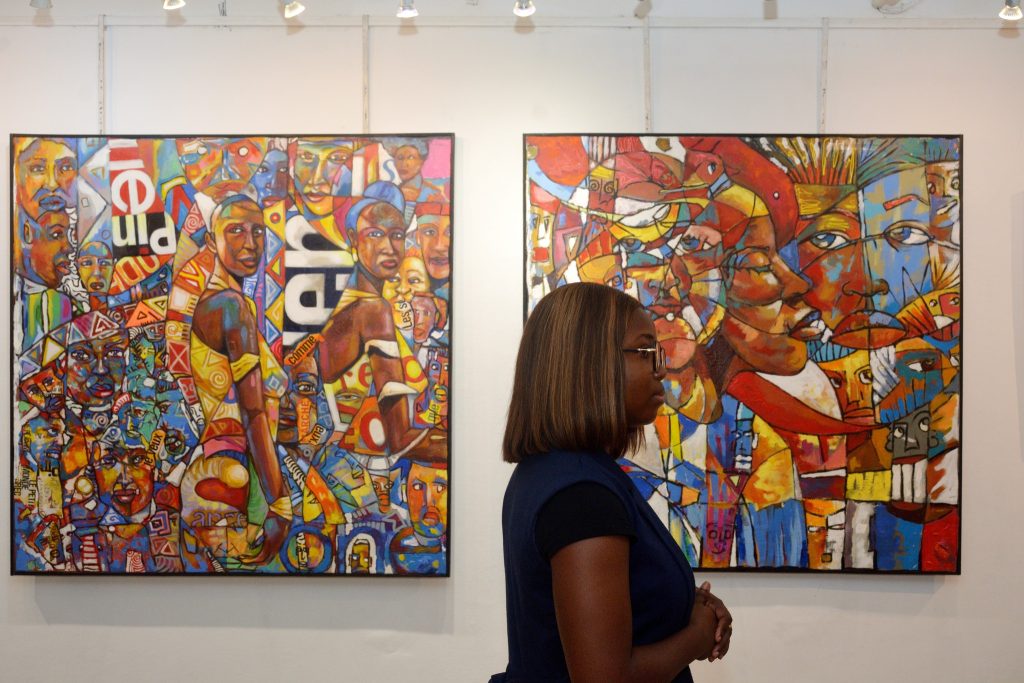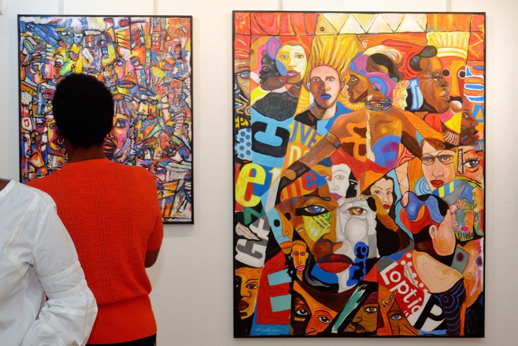 Les couleurs : Le visiteur de l’exposition est accueilli par des couleurs chaudes, chatoyantes dominées par le jaune, l’orange et le rouge. Expressions de la sincérité africaine, la joie de vivre symbolisée par le soleil, la chaleur, ces couleurs communiquent. Elles expriment avec les autres teintes, le partage, la générosité des peuples d’Afrique. « Les couleurs vives sont franches », admet l’artiste. Elles sont les incarnations des marchés bigarrés et multicolores du continent, toute chose qui les rend vivantes.